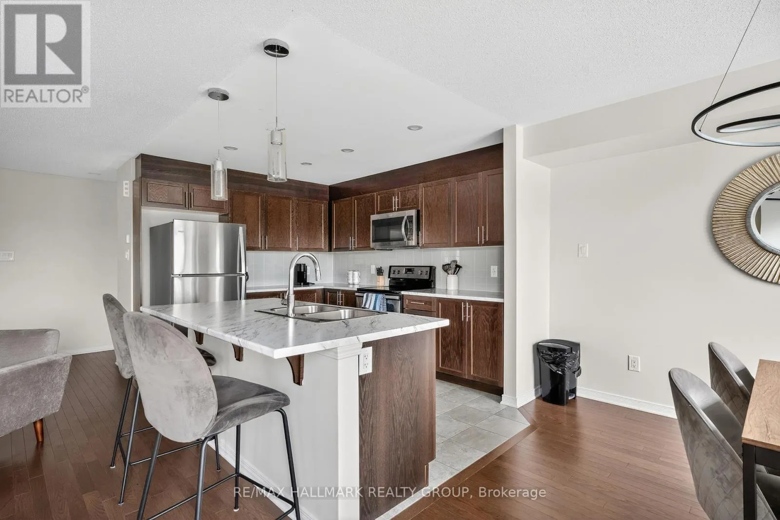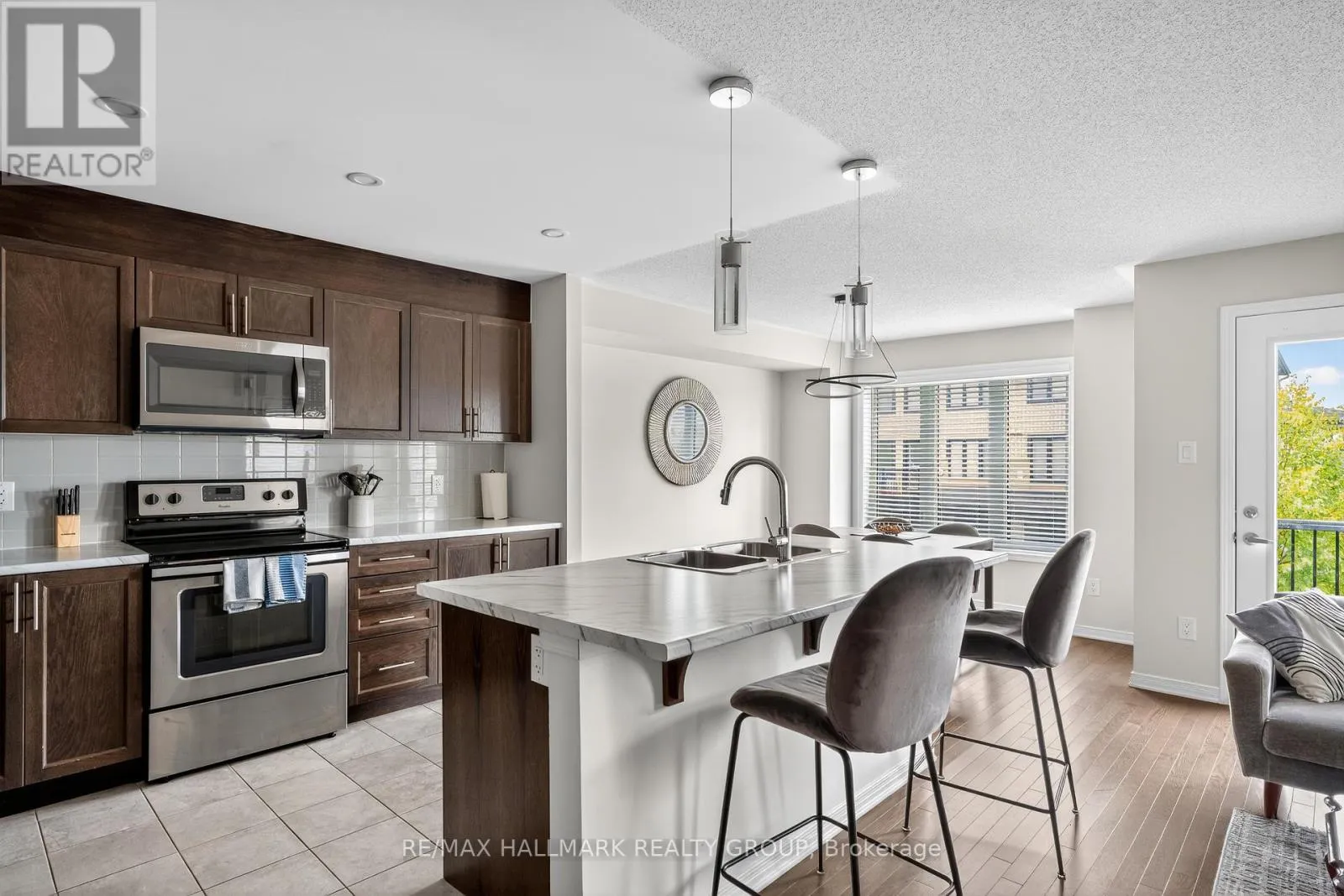 +"PublicRemarks": "END UNIT Beautifully Updated and Move-In Ready Townhome! Modern 2 bedroom, 2 bathroom townhome offering a perfect blend of style, comfort, and convenience in a sought-after location. Attractive exterior with single car garage and additional driveway parking. The main level features a bright flex space ideal for a home office, gym, or studio, along with convenient garage access. Stairs lead to a spacious second floor with hardwood flooring, pot lights, and large windows that fill the space with natural light. The open concept living and dining areas flow into a modern kitchen with stainless steel appliances, tiled backsplash, ample cabinetry, generous counter space, and a breakfast bar. Walk out to your private balcony, perfect for enjoying your morning coffee or relaxing in the evening. The top floor offers two well-sized bedrooms with plush carpet. The primary bedroom includes a large walk-in closet. A convenient laundry room is on the top floor! A full bathroom completes this level. Located on a quiet private street just minutes from parks, schools, shopping, restaurants, and everyday essentials. Truly move-in ready. Book your showing today! (id:62650)"