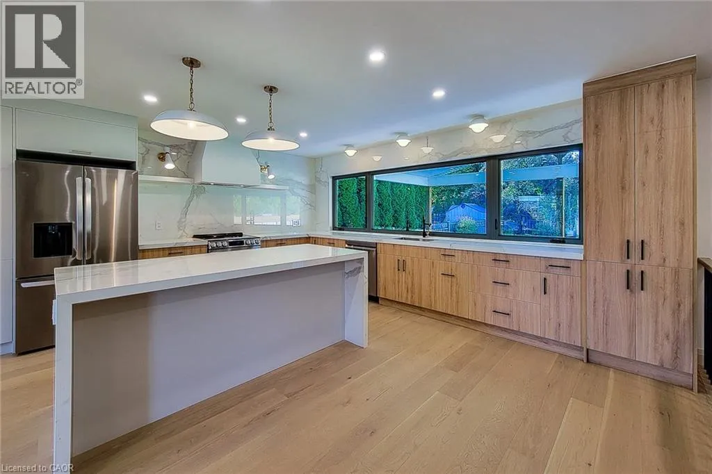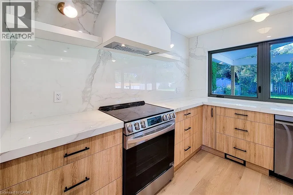 +"PublicRemarks": "This immaculate 3-bedroom, 2-bath bungalow has been completely renovated, offering 1,255 sq. ft. of modern, carpet-free living. The open-concept main floor features bright, spacious living and dining areas with gleaming hardwood floors and oversized windows that fill the space with natural light. The stylish eat-in kitchen is perfect for any home chef, featuring stainless steel appliances, a tiled backsplash, generous cabinetry, and an island with a breakfast bar for casual dining. The contemporary 3-piece main bathroom showcases elegant finishes, while the primary suite includes custom built-in wardrobes and a spa-inspired 3-piece ensuite with a walk-in shower. The full, unfinished basement provides endless potential whether for additional living space or an in-law suite with a separate entrance already in place. Step outside to enjoy the private, covered concrete patio and low-maintenance backyard, perfect for relaxing or entertaining. Situated in a quiet, family-friendly neighborhood, this home is within walking distance to schools, parks, and the GO Station, with quick access to the mountain and QEW. With 200 amp service and exceptional upgrades throughout, this home is truly move-in ready a must-see! (id:62650)"